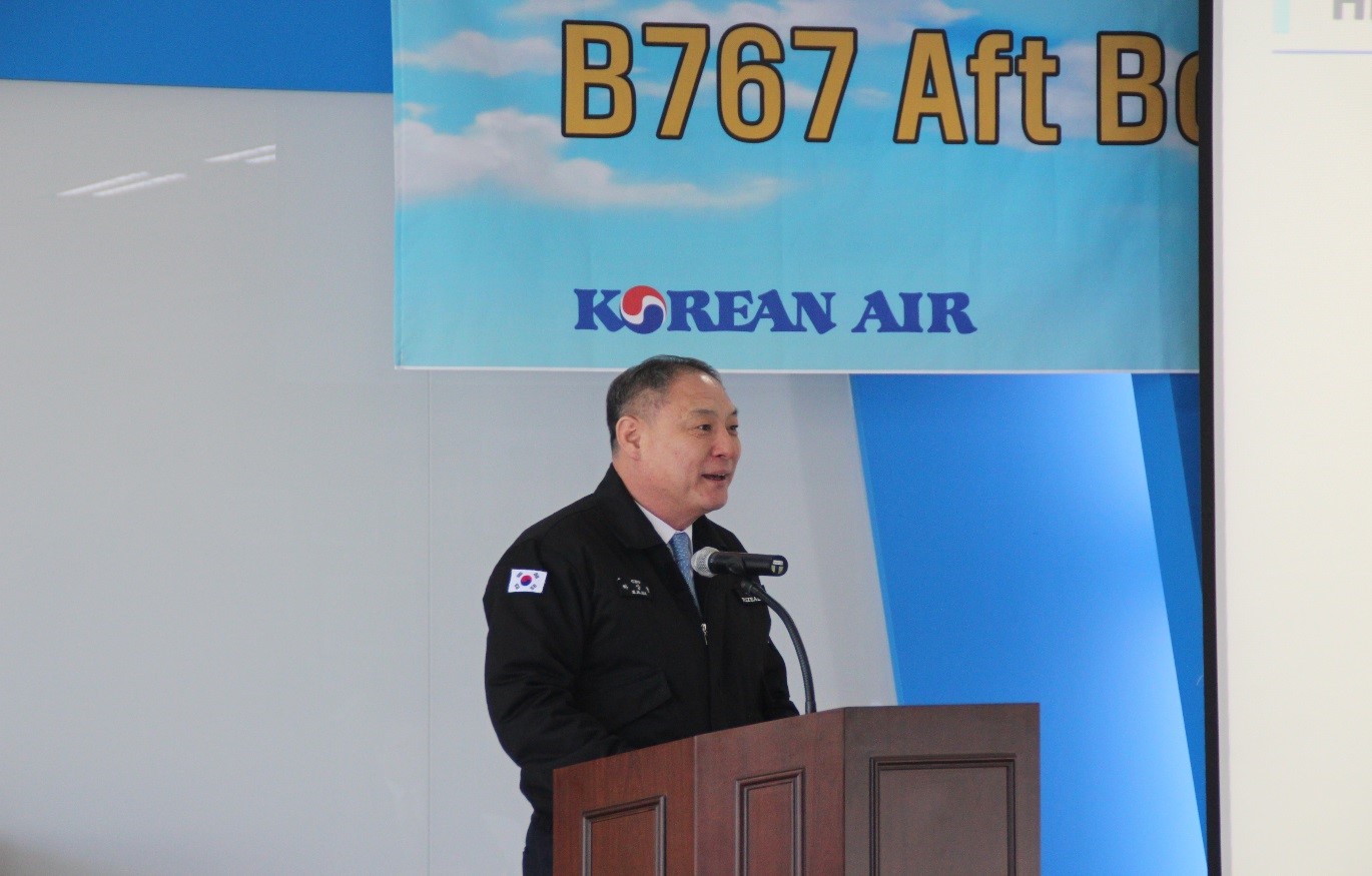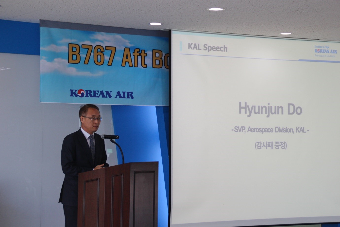 Se-Kyung, Lee who is in HIZEAERO begin with the honor guest introduction and event information, Jung-ho Cho who is Executive Director of B767 Aft Body Tailcone business, has been presenting B767 Business history since 2014.
